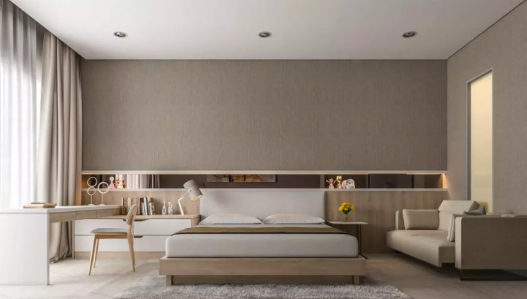 臥室如果高度不夠,不建議設(shè)計(jì)吊頂,因?yàn)闀?huì)給人一種累贅感,但是如果高度適宜,可以打造一個(gè)比較簡(jiǎn)易的吊頂,這就要求吊頂每個(gè)設(shè)計(jì)面板的接縫一定要嚴(yán)密。
