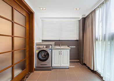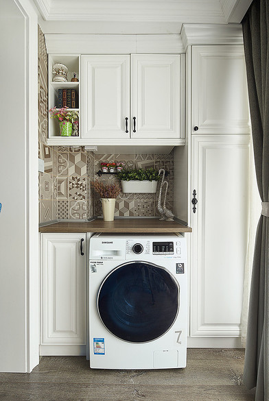 當(dāng)空間不夠用,洗衣機(jī)即便只有半平方米的大小也可能成為問題。所以在廚房空間配置時,只需要在角落位置空出一個小櫥柜的位置,只要遠(yuǎn)離火源一些即可。