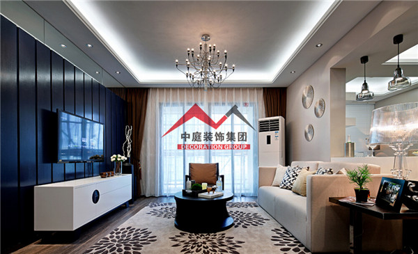 客廳主要運(yùn)用灰調(diào)做主調(diào),深藍(lán)色的電視背景墻凸顯出區(qū)域感,讓整個空間充滿神秘又不失格調(diào)的優(yōu)雅。