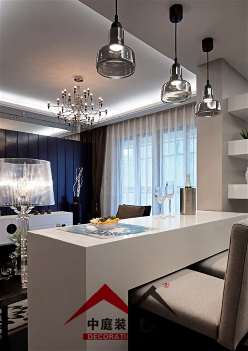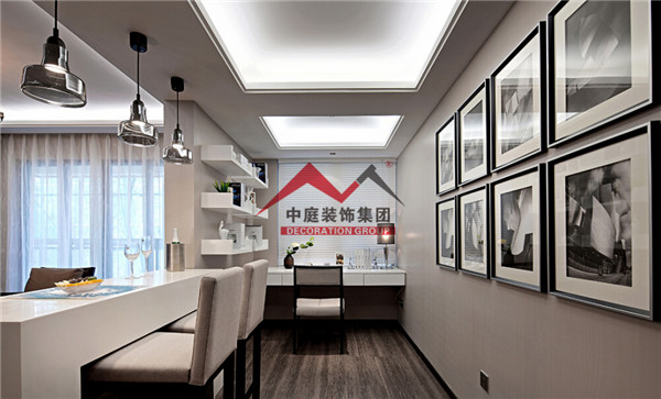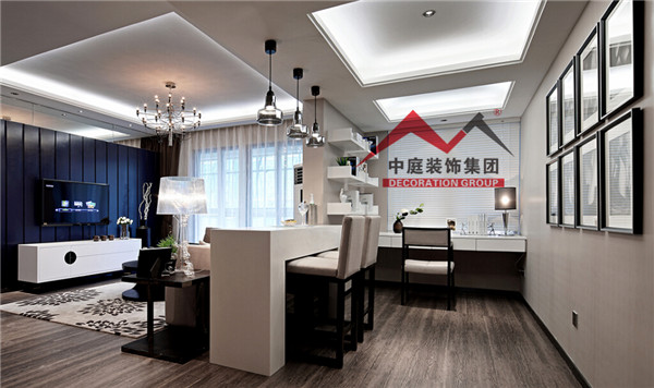 中間用一個吧臺把客廳和書房隔開,即實(shí)現(xiàn)了一個大客廳的視覺空間效果,又增加了客廳的裝飾生活情趣。