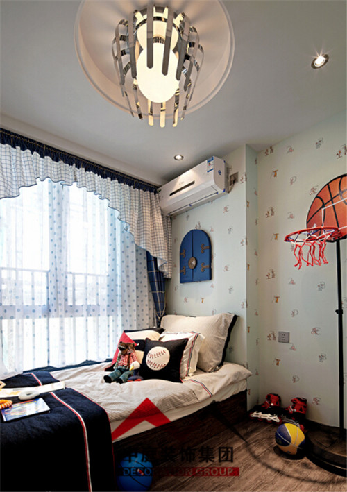 為了增加小孩的臥室樂趣,采用墻紙裝飾整體。榻榻米式的床側(cè)面做了幾個抽屜,增加了儲物空間,正以放小朋友的玩具。