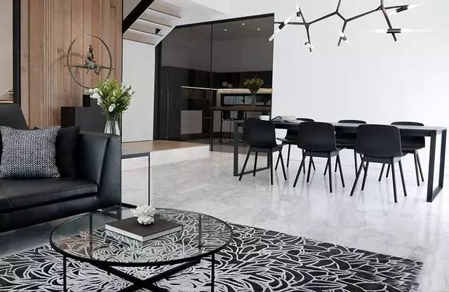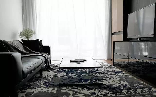 ▲黑白拼色花紋的地毯搭配圓形的玻璃茶幾,為我們展示了同種材質(zhì)的多種美感。