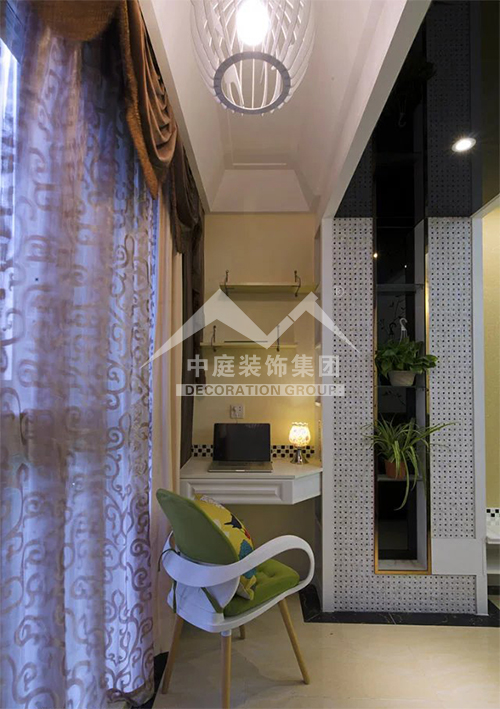 將陽(yáng)臺(tái)用玻璃和木材封閉成居家小書(shū)房,窗外的綠葉仿佛伸手可及,好像馬上就會(huì)進(jìn)入居室,自然與居室就這樣在陽(yáng)臺(tái)這個(gè)小小空間相交融。為了節(jié)約空間,可將書(shū)桌、書(shū)架和文件柜都設(shè)計(jì)得很小巧別致,既提供了完善的實(shí)用功能,又不多占空間。