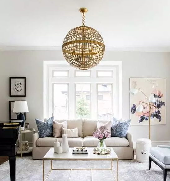 如果不想裝吊頂,可以利用石膏線、吊燈、射燈、以及和墻面樣式顏色的配合,都很容易營造出質(zhì)感。