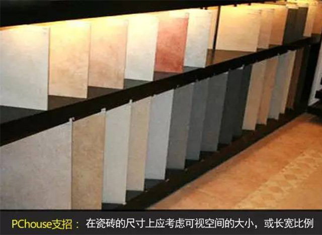在瓷磚的尺寸上應(yīng)考慮可視空間的大小,如果客廳被家具遮擋的地方多,也就是地面使用時,人的實際可視的大小,如果可視面積小的話,也應(yīng)考慮用小一點規(guī)格的。又或者考慮客廳的長寬比例及大小,就效果而言,以瓷磚能全部整片鋪貼為好,就是指到邊盡量不裁磚或少裁磚,盡量的減少浪費,一般而言,瓷磚規(guī)格越大,浪費也越大。
