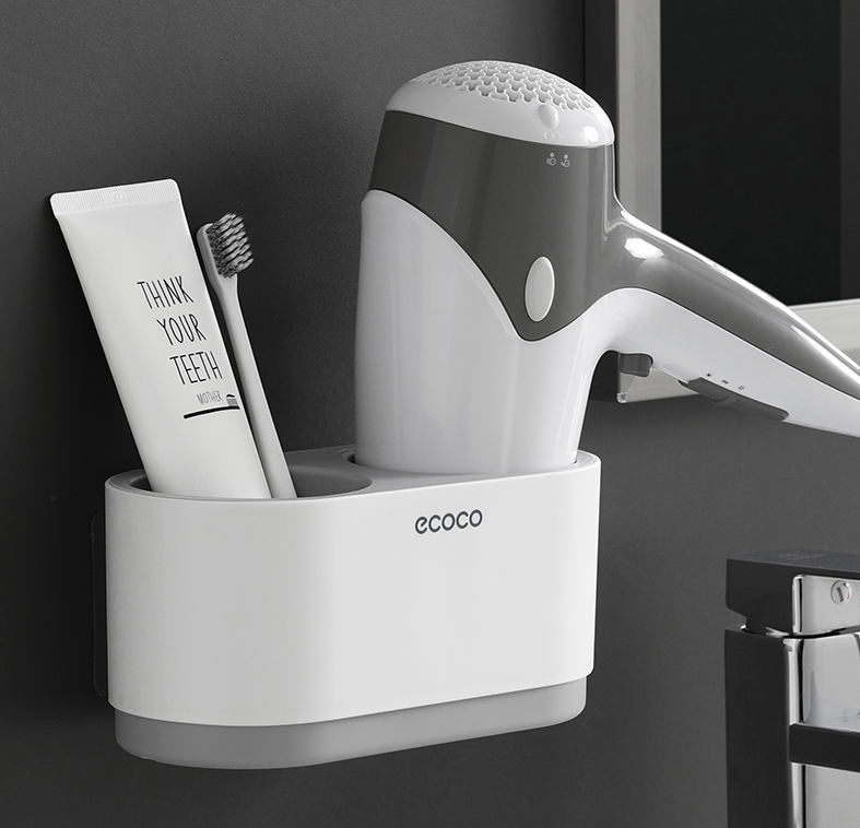 有兩個(gè)收納筒,一邊可以放梳子、剃須刀等,另一邊就放吹風(fēng)筒啦,風(fēng)嘴小于8cm的吹風(fēng)筒都合適,掛墻上不占地兒。