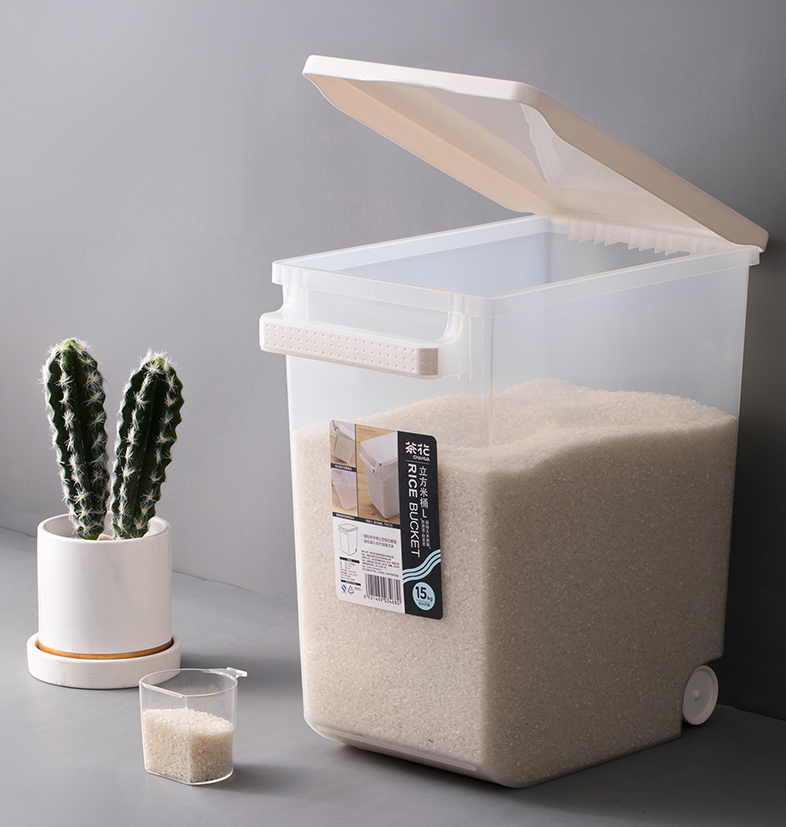 密封膠圈設(shè)計(jì),利于密封保存,而且塑料米桶防塵又防潮,容量大,能儲(chǔ)藏30斤大米。設(shè)手柄和腳輪,搬運(yùn)方便,底部是弧形的拐角,利于刮取剩下的少量米。