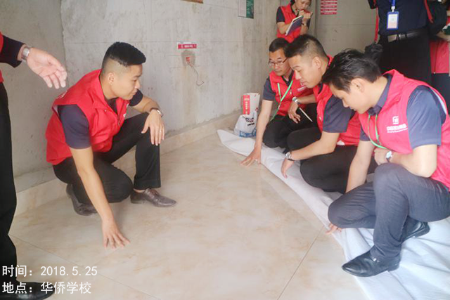 巡檢小組檢驗地磚鋪設的平整度,沒有發(fā)現拱背現象
