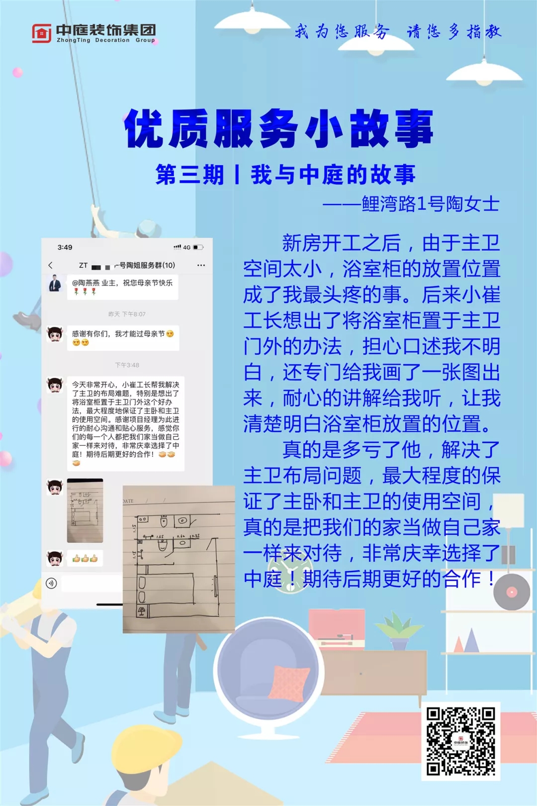 首席設(shè)計(jì)師廖吉柯服務(wù)客戶到凌晨,專業(yè)的服務(wù)讓客戶選擇了中庭,與中庭攜手共筑愛家。