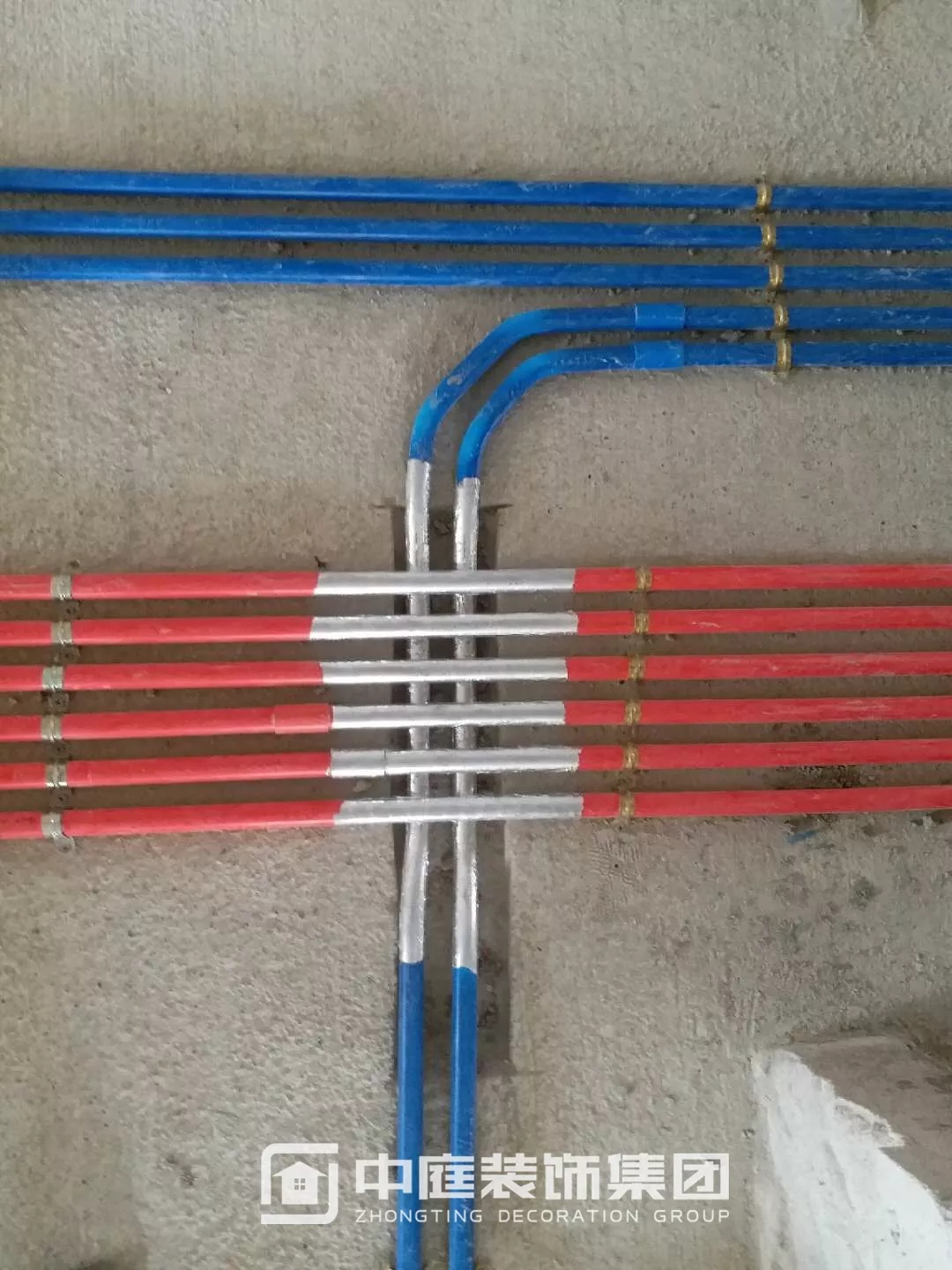 施工現(xiàn)場(chǎng)線管鋪設(shè)橫平豎直,按照集團(tuán)施工規(guī)定使用鐵皮卡扣固定,管和管之間留有足夠縫隙,以便鋪設(shè)地磚時(shí)水泥砂漿進(jìn)入管下,避免地磚后期出現(xiàn)空鼓;
