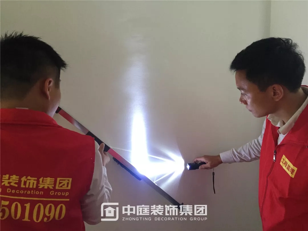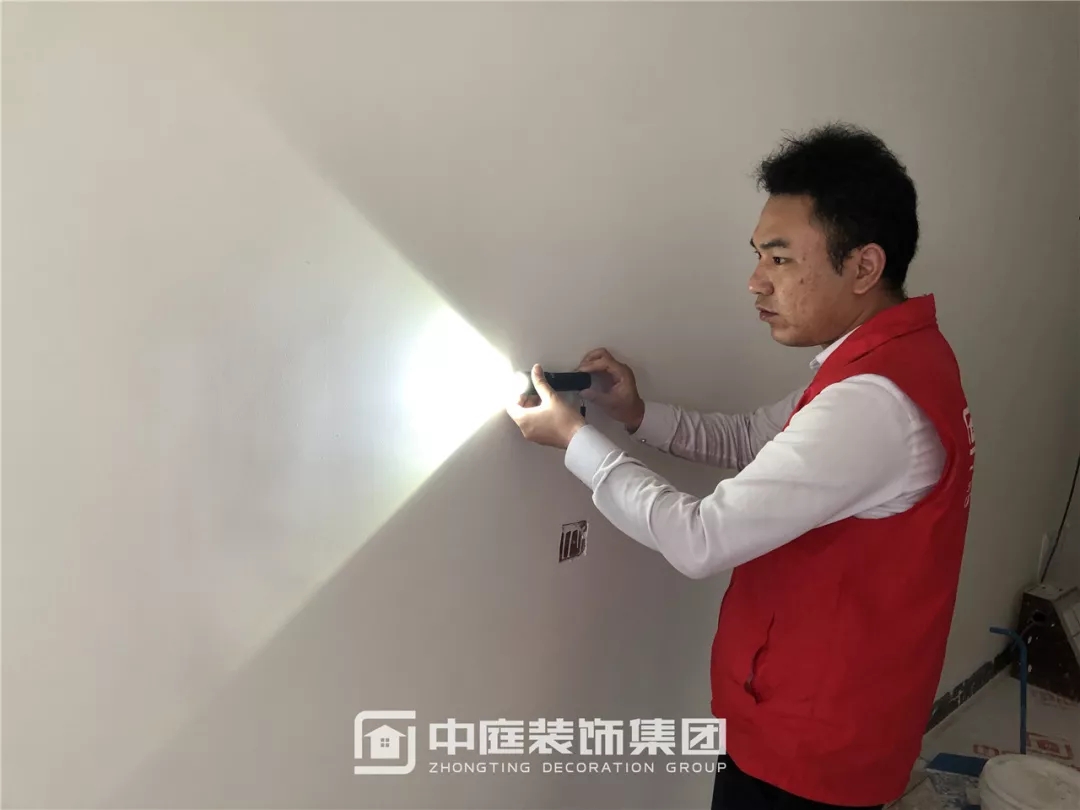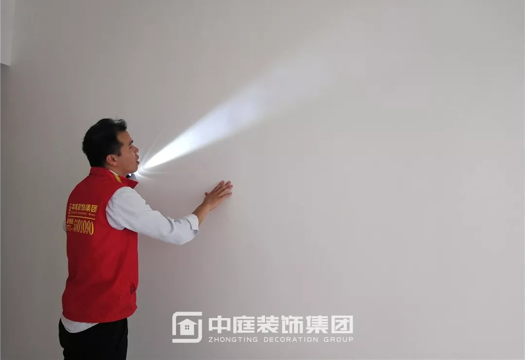 使用強(qiáng)光手電檢查墻面膩?zhàn)邮┕な欠襁_(dá)標(biāo)