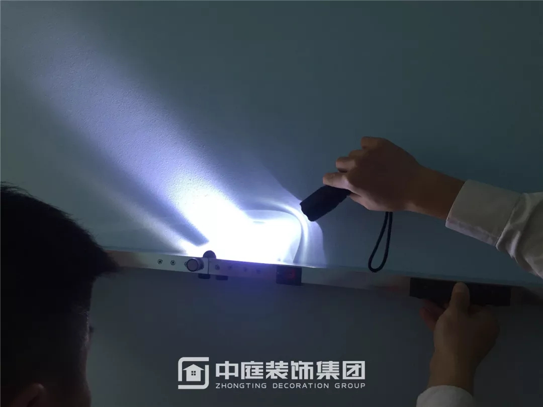 強(qiáng)光光線無法穿透靠尺并產(chǎn)生折射,墻面平整度達(dá)標(biāo)。