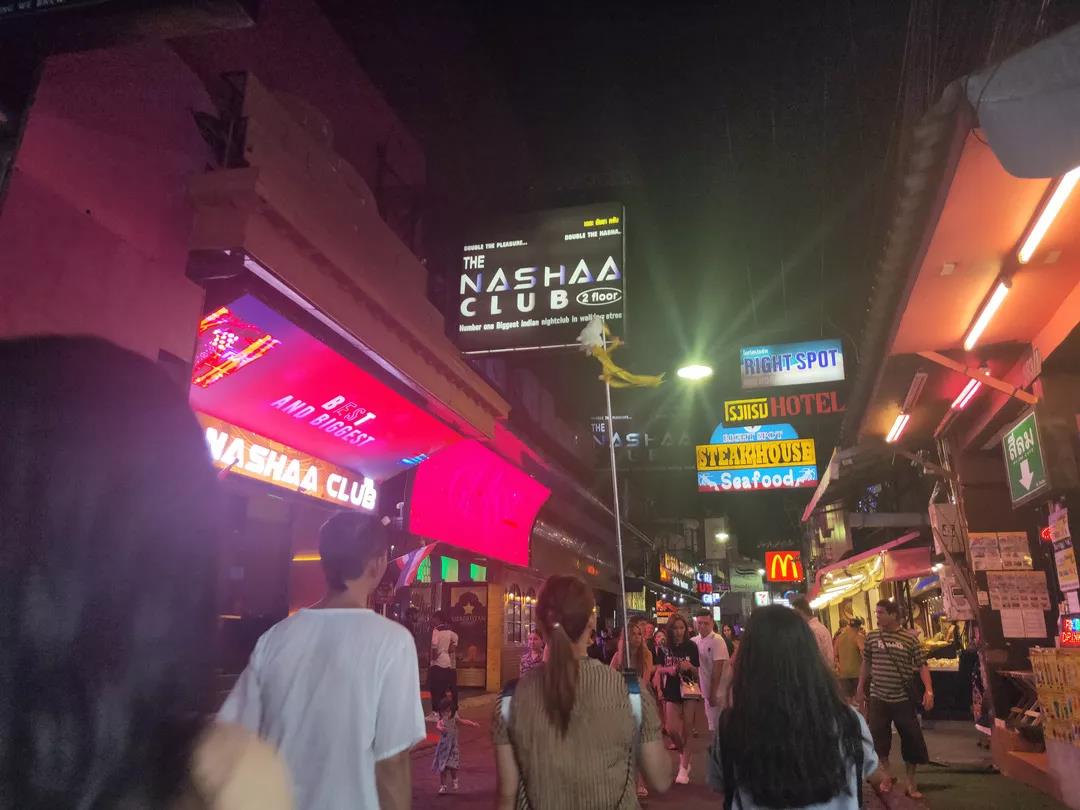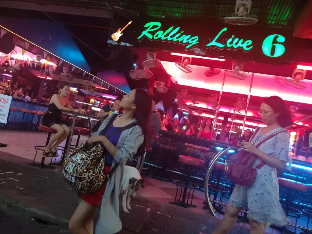 芭提雅泰俄風(fēng)情步行街兩旁有各式小吃、酒吧,街上熙熙攘攘,是游客必經(jīng)之地。酒吧中經(jīng)常有音樂表演、泰拳表演。行走的、兩旁酒肆咖啡屋閑坐的,十之七八是西方白種人。白天相對冷清,一到晚上燈火通明,夜夜笙歌,燈紅酒綠,這里是個一刻也不寧靜的嘈雜世界,這是西方白人娛樂的天堂。