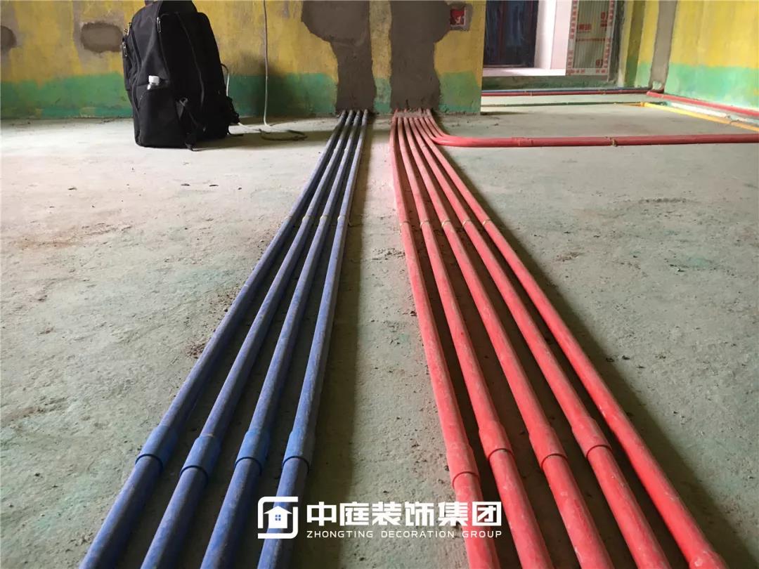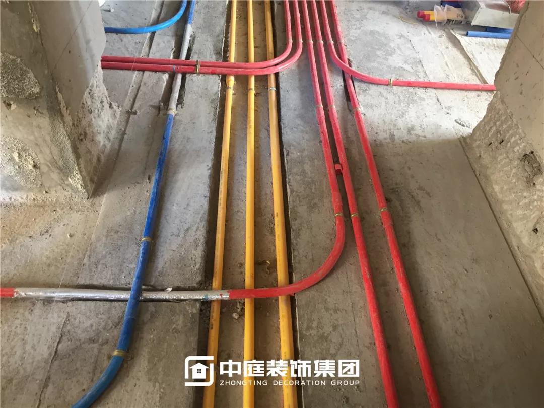 施工現(xiàn)場線管鋪設(shè)橫平豎直,按照集團(tuán)施工規(guī)定使用鐵皮卡扣固定,管和管之間留有足夠縫隙,以便鋪設(shè)地磚時水泥砂漿進(jìn)入管下,避免地磚后期出現(xiàn)空鼓。