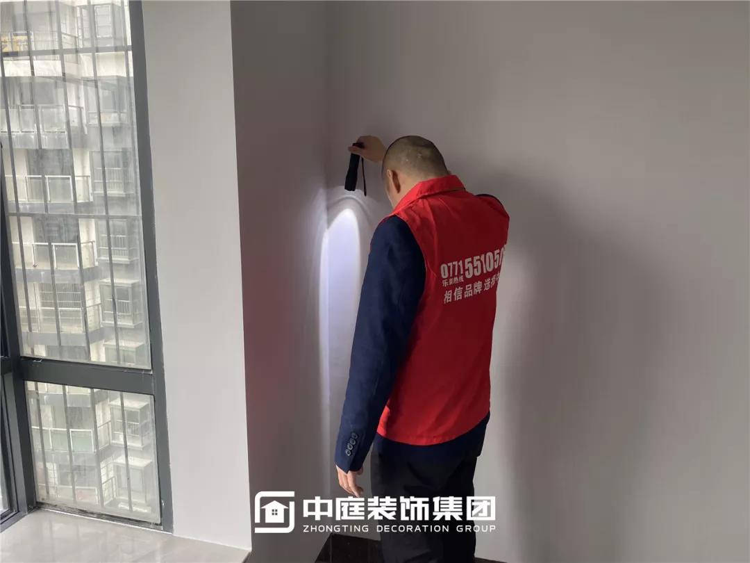 使用強(qiáng)光手電檢查墻面、陰角膩子施工打磨情況,施工是否達(dá)標(biāo)。