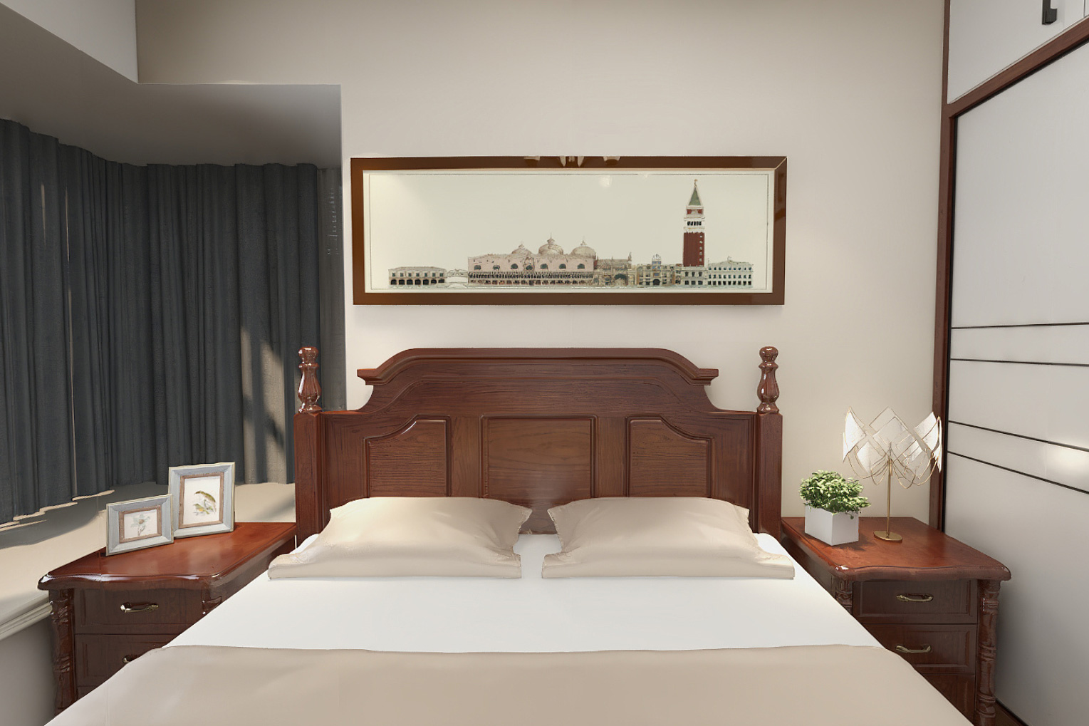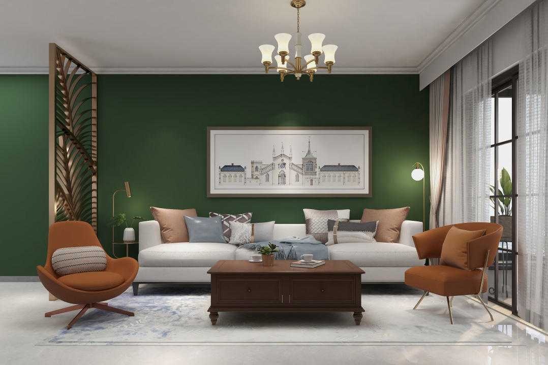 整體色調(diào)以奶咖色為主,加以綠色點綴,大膽的撞色使整體空間顯得活躍又多了幾分復(fù)古韻味。在家具搭配上多為木制家具,木制家具自然溫潤的特性讓人感覺舒適放松,設(shè)計簡潔卻不失特色。