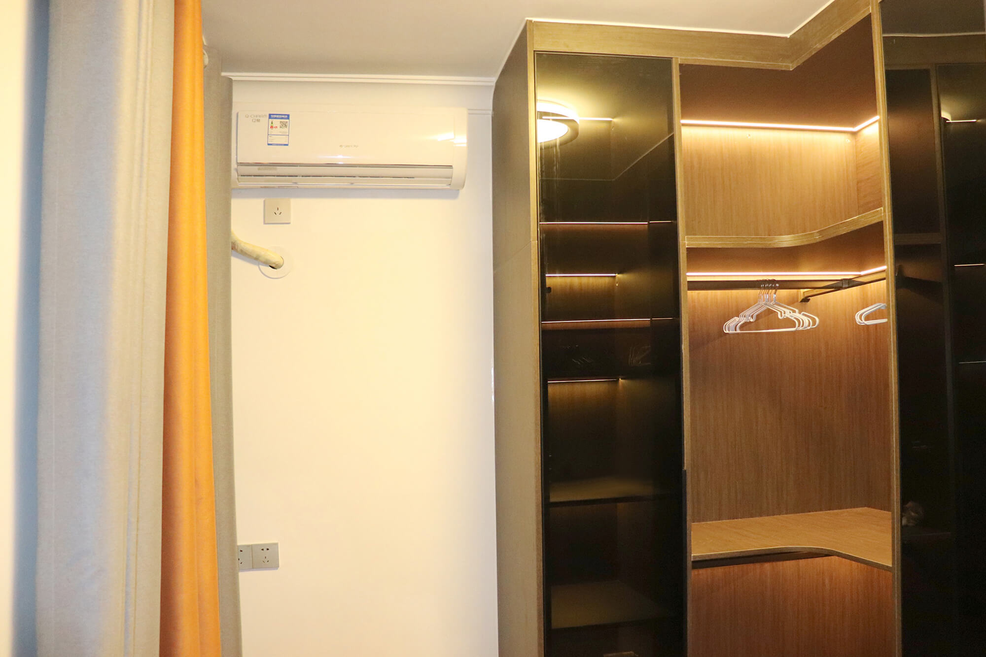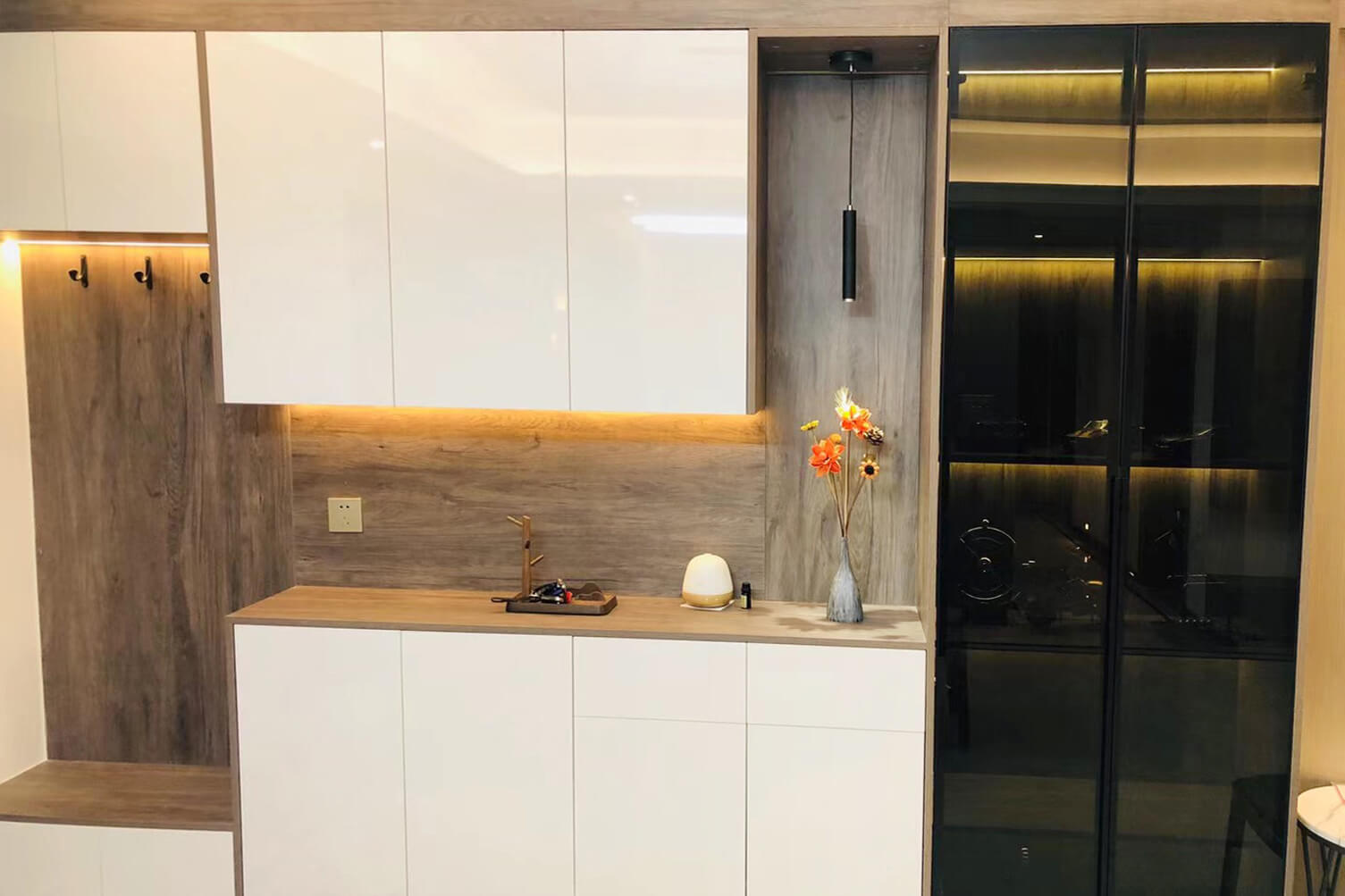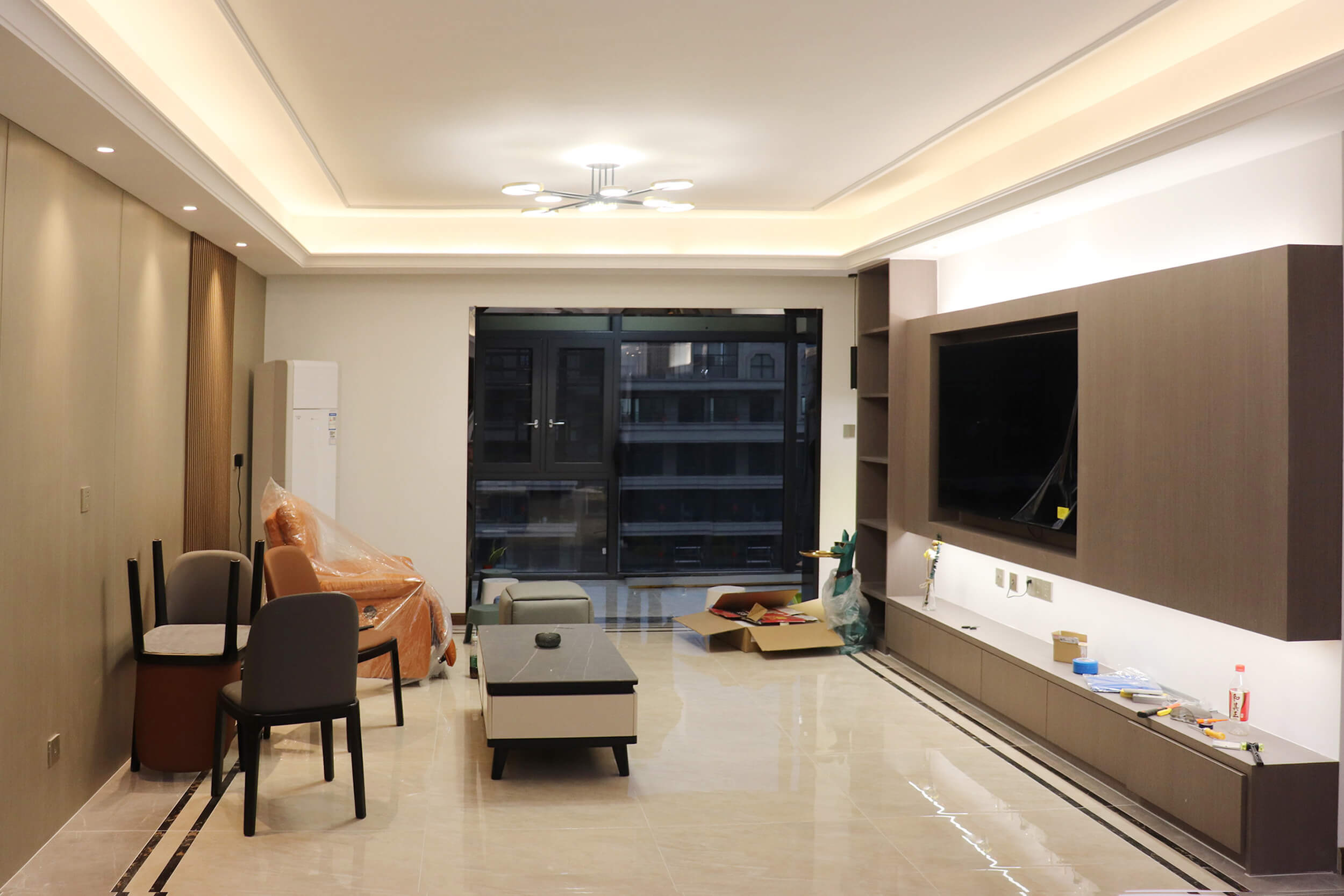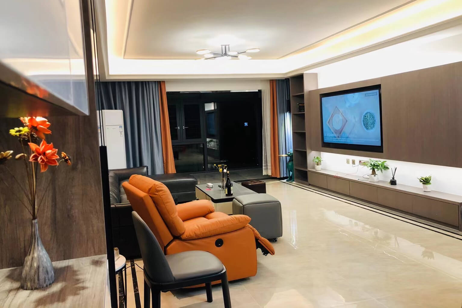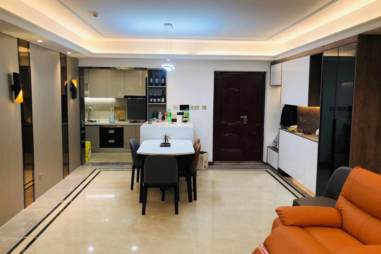 客餐廳選擇素色的木飾面顯現(xiàn)低調(diào)有內(nèi)涵,整個客廳及餐廳的吊頂直接一體貫穿,搭配著電視背景墻長方體設(shè)計突顯空間的寬闊大氣,愛馬仕橙色的窗簾及單人沙發(fā)的呼應(yīng),增添了空間的活躍性;暖黃色燈光下白色的大理石吧臺及白色的高光柜門使得空間不再昏沉,局部黑色的鈦金夾著茶色的鏡面在大面積的素色木飾面的包裹下將現(xiàn)代的低調(diào)且奢華體現(xiàn)完美的體現(xiàn)了。