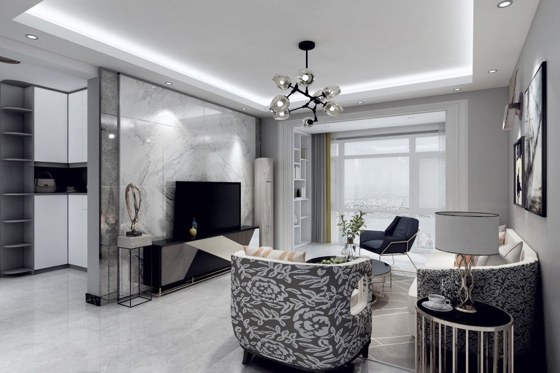 房屋整體主色調(diào):黑白灰,踏入房門首先看到的是灰色墻面和黑色的矮柜形成鮮明的對比。給人的第一感覺有浪漫、時尚,卻不失美式中特有的奢華。墻面以灰色為主,地板以深灰色為主色。整體空間的動線非常流暢,給人很舒服的感覺??蛷d整體設(shè)計偏美式,硬裝選色大氣,配以布藝沙發(fā)的軟裝,硬裝配以現(xiàn)代風(fēng)格的電視背景墻,整體給人的感覺穩(wěn)重而簡潔。美式的顏色不可過于濃重,在混搭風(fēng)格中,只可點綴,它的作用是調(diào)節(jié)空間整體的氣氛。