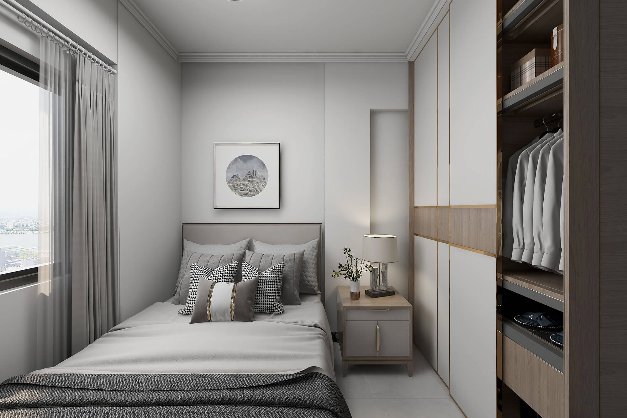 瀏覽量:568本案戶型為:3房2廳2衛(wèi),總面積72㎡。本案風(fēng)格為新中式,在空間中以淺灰色為主色調(diào),將中式元素以生活的面目表達(dá)出來。在造型、擺件等上面采用一些中式手法,為空間增添高雅秀逸的意境美,使得整體空間賞心悅目,并充滿韻味。