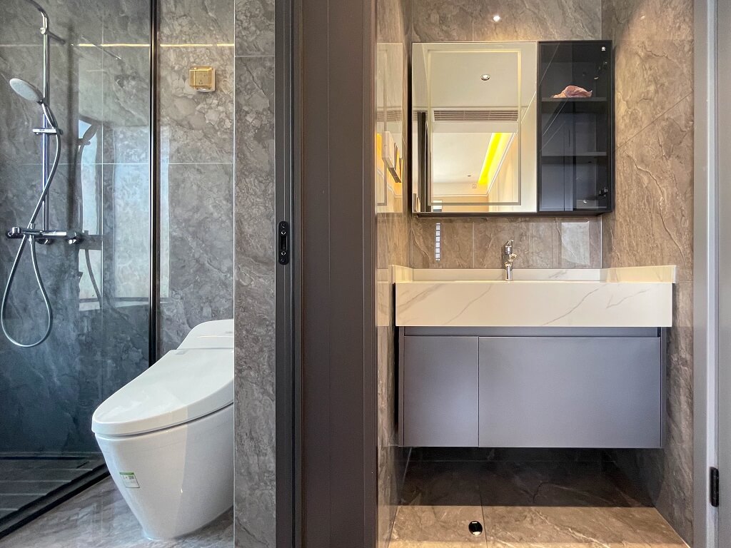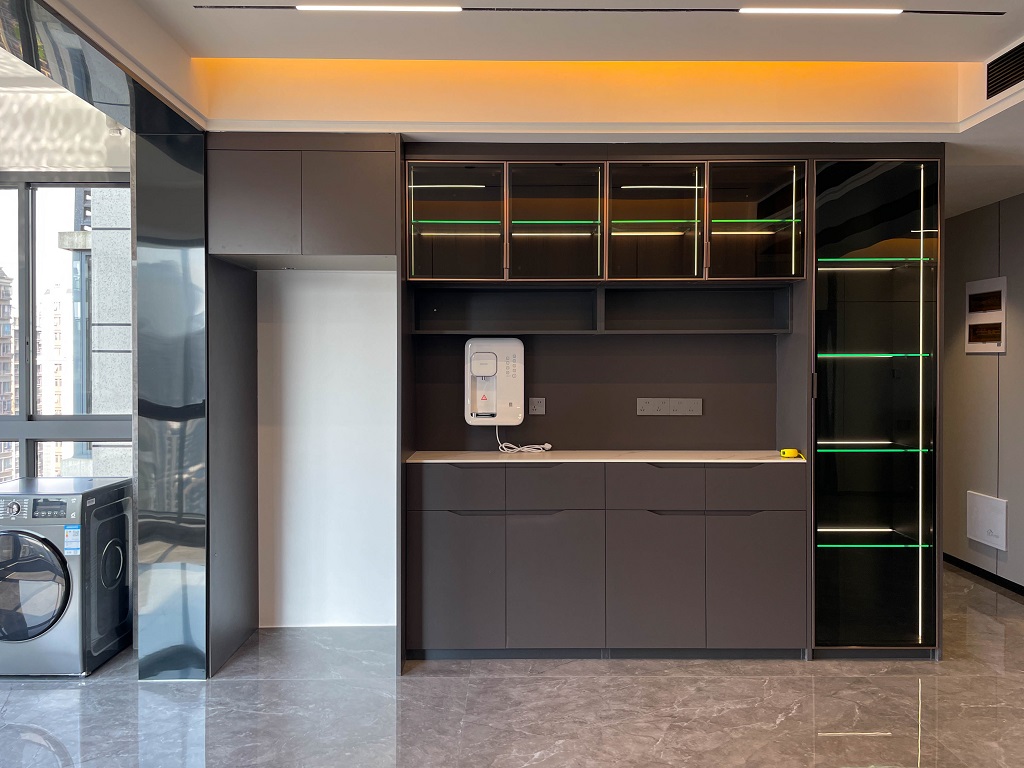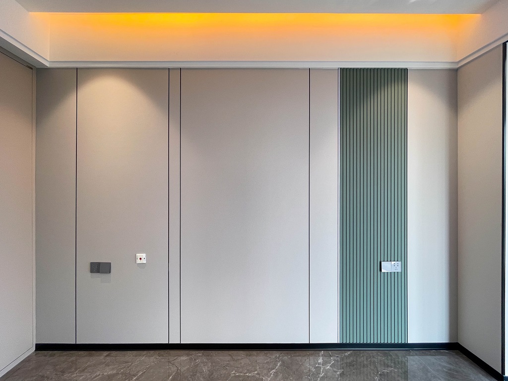 整屋采用黑色亮面護墻板,與全屋通鋪的灰色瓷磚形成和諧統(tǒng)一的整體風格,無主燈的設計,通過局部照明和燈帶的巧妙運用,營造出柔和的光線氛圍。雙眼皮吊頂和兩邊吊頂疊加的設計,為空間增添一份獨特的層次感。