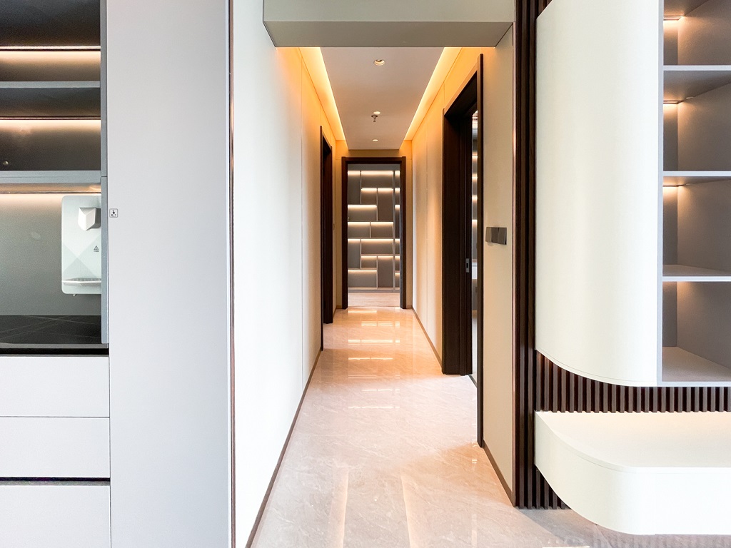 陽臺和空間色調(diào)相輔相成的大面積落地窗,干凈規(guī)整的收納儲物空間柜,找到美的共鳴。