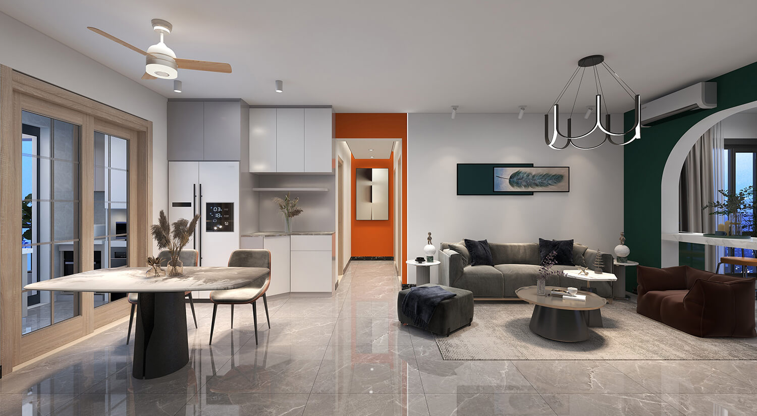 本案例戶型為:3房1廳1衛(wèi),總面積125㎡。這是一套輕奢風(fēng)格的房子。設(shè)計師采用開放式布局,將客廳、餐廳融為一體。這樣不僅增加了家庭成員的互動和交流,也可以讓房間看起來更加寬敞。輕奢金屬飾品與布藝沙發(fā)的結(jié)合,使得畫面具有時尚感又不乏溫馨。