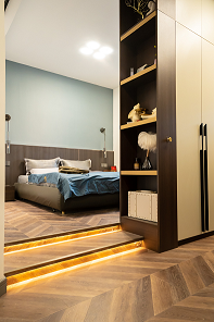在臥室的臺(tái)階處制作地臺(tái),加燈帶氛圍烘托氣氛,做柜子有效隔開(kāi)衣帽間獨(dú)立空間。