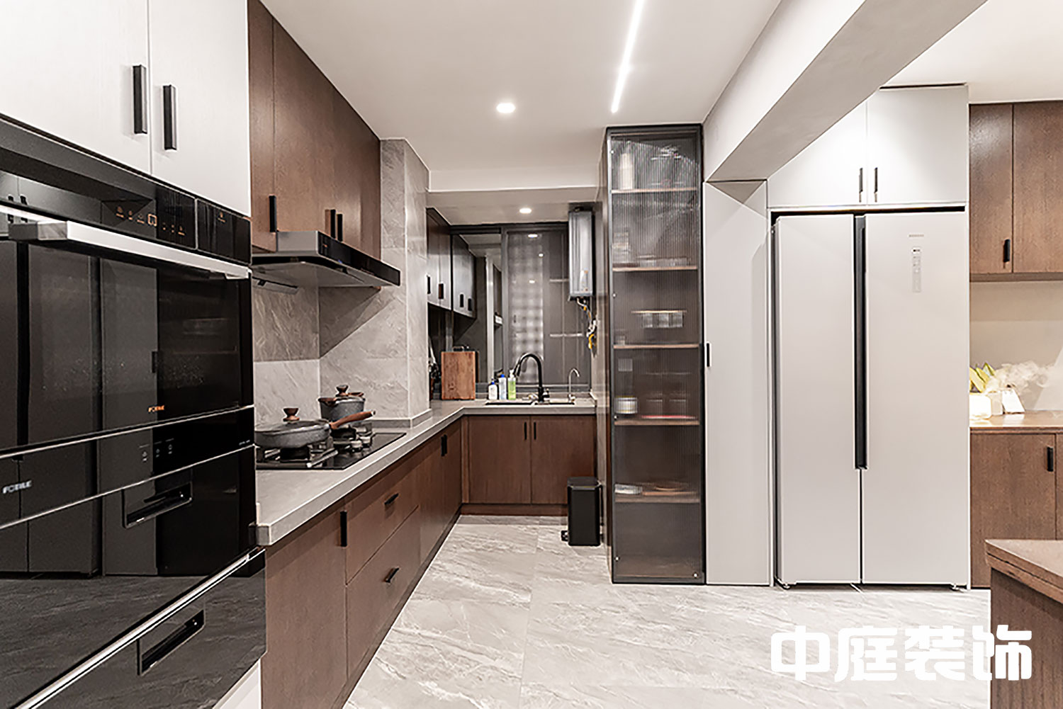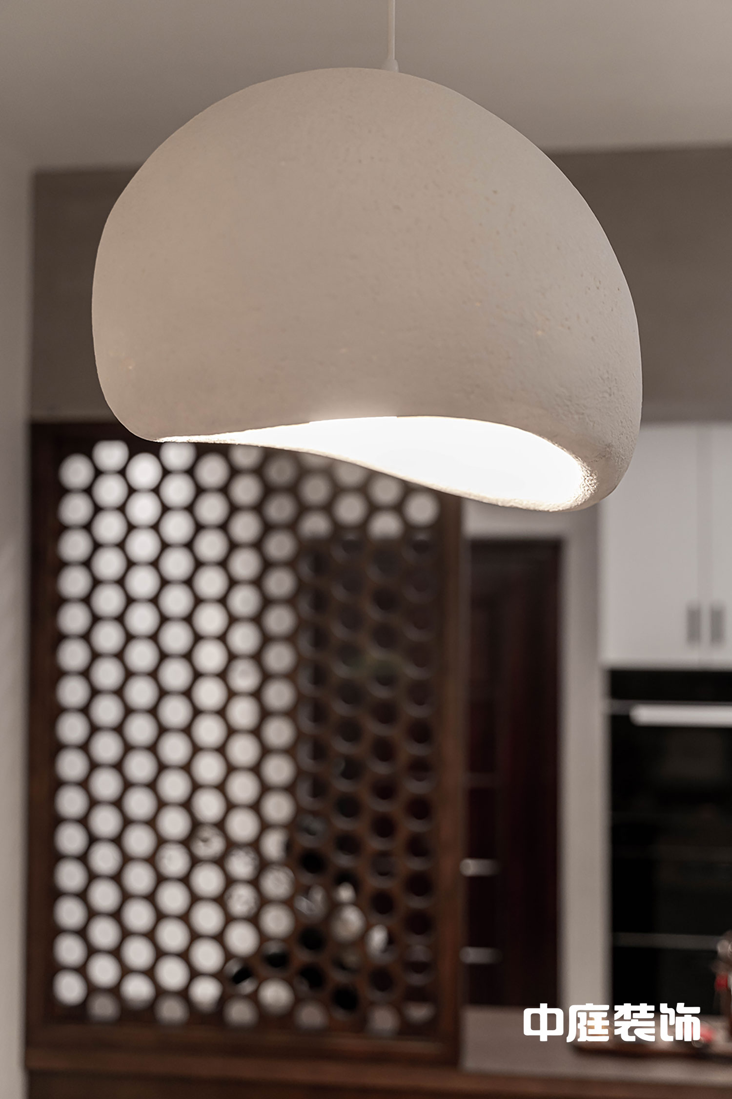 設(shè)計(jì)開(kāi)放式廚房,西廚邊安置嵌入式冰箱,空間秩序的重組,讓餐廚區(qū)域更顯開(kāi)闊,實(shí)木櫥柜的顏色更顯深韻,越看越有其中味道。長(zhǎng)虹玻璃門(mén)式的酒柜參與中西廚之間,廚房舍棄以往的扣板吊頂,轉(zhuǎn)用石膏板吊頂,筒燈代替。在這里,總歸要卸下一身疲憊,與生活默然對(duì)話(huà)。